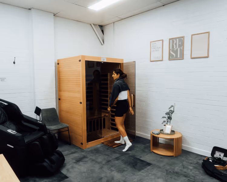 We have luxurious, private recovery rooms, each containing an infrared sauna, zero-gravity massage chair, compression boots, and a massage gun with a hot/cold contrast therapy head. Your 45 minute booking gives you access to all of these amazing recovery aids.